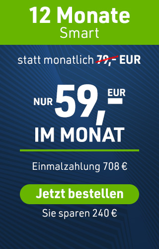 - 12 Monats Abo für 59€/Monat (bei Einmalzahlung in Höhe von 708€)